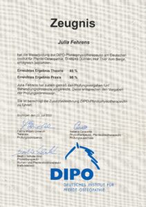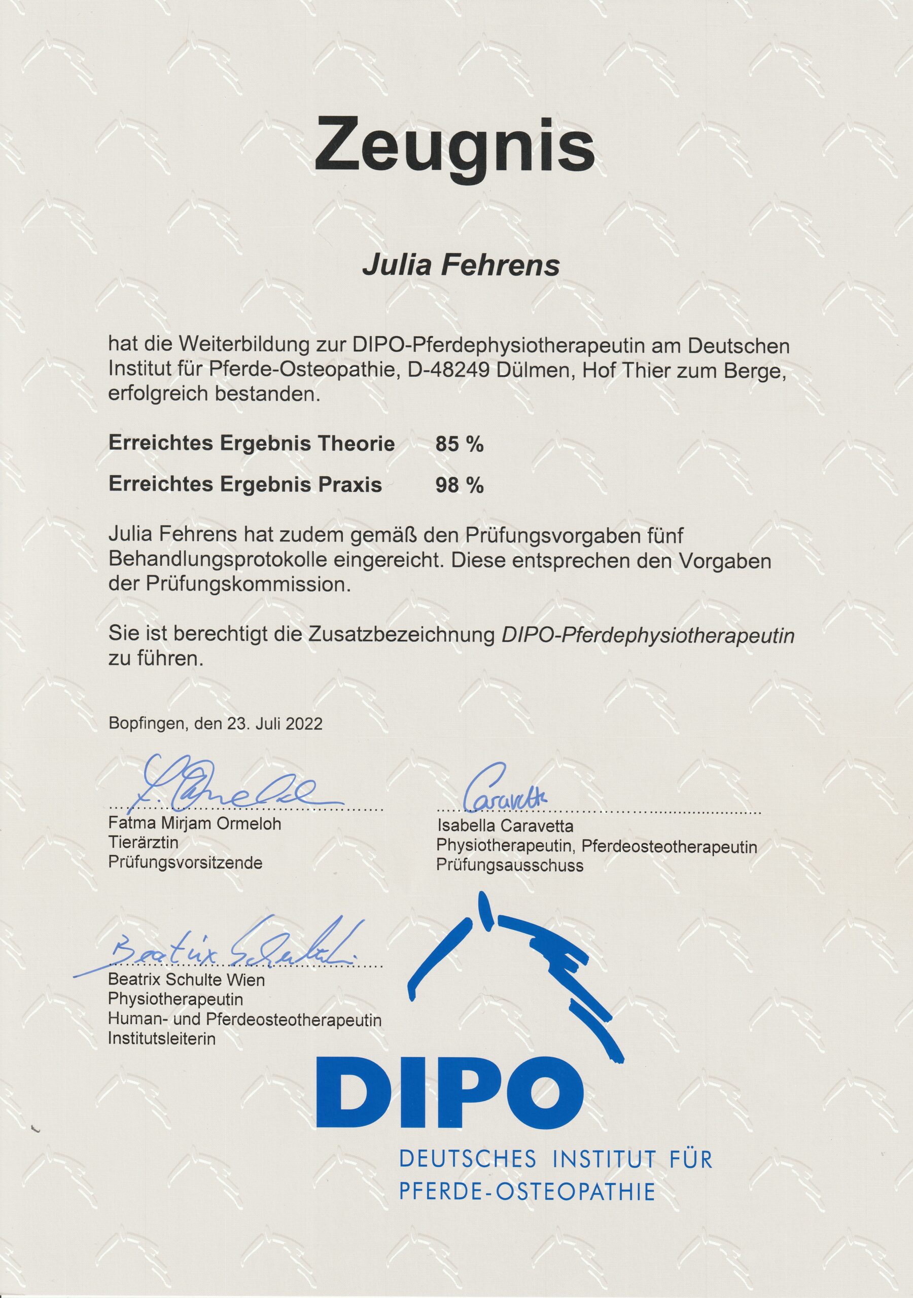 - 07/2022 Abschluss zur Pferdephysiotherapeutin (Deutsches Institut für Pferdeosteopathie – DIPO)
